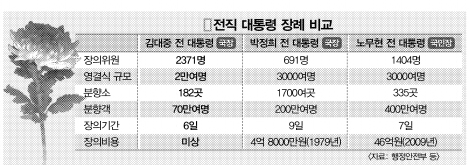 하지만 김 전 대통령의 장례식이 최대 기록만을 남긴 것은 아니다. 분향소나 분향객 수는 노 전 대통령과 박 전 대통령 때보다 적었다.