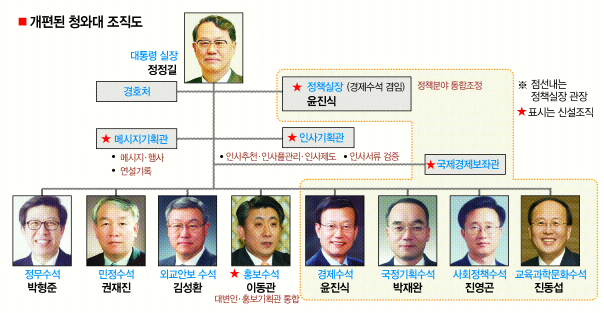 윤진식 경제수석은 대통령부실장격인 정책실장을 겸임하게 돼 전공인 경제를 넘어 정책 분야를 총괄하는 ‘왕수석’으로 지평을 넓혔다. 경제, 사회정책, 교육과학문화, 국정기획 등 정책분야 수석 등이 참여하는 ‘정책조정회의’를 상시적으로 주재한다. 정정길 대통령실장과 함께 2실장 체제를 구축하게 된 셈이다.
