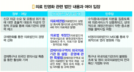 반면 야당과 시민단체는 의료 민영화로 인해 의료 서비스 양극화를 부추기는 법안이라며 반발하고 있다.