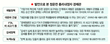 4일 경제학계에 따르면 정 내정자가 지금껏 현 정부를 비판했던 수위는 민주당 등 야당의 수준을 넘어선다. 그는 ‘감세는 부자의 재산만 늘려주는 이데올로기’이고, ‘자유무역협정(FTA)은 만병통치약이 아니다.’라고 지적해 왔다.