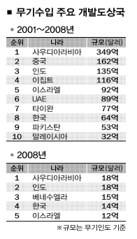 │워싱턴 김균미특파원│한국이 지난 2001~2008년 수입한 재래식 무기는 모두 64억달러어치인 것으로 조사됐다. 지난해에만 14억달러어치의 무기를 수입, 개발도상국 가운데 사우디아라비아와 인도, 베네수엘라에 이어 네번째로 무기를 많이 수입했다. 이는 실제로 무기가 인도된 기준이며, 무기 구매계약 기준으로 할 경우 76억달러로 집계됐다.