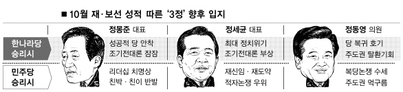 5곳의 재·보선 지역 가운데 한나라당이 경남 양산과 강원 강릉을 비롯해 3곳 이상에서 승리한다면 정몽준 대표는 날개를 달 수 있다. 성공적 안착이라는 평가를 받는 것은 물론 당내 장악력을 높이는 계기를 마련할 수 있다. 내년 2월 조기전대론도 한풀 꺾일 전망이다.