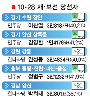 28일 치러진 재·보선에서 민주당이 5개 선거구 가운데 경기 수원 장안과 안산 상록을, 충북 증평·진천·괴산·음성 등 3곳에서 승리했다. 각각 민주당의 이찬열·김영환·정범구 후보가 한나라당 후보를 눌렀다. 한나라당은 텃밭인 경남 양산과 강원 강릉에서 박희태 후보와 권선동 후보가 당선됐다. 이로써 국회 의석은 한나라당 169석, 민주당 86석이 됐다.