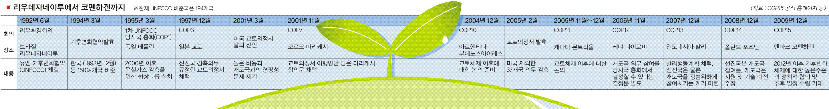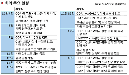 인류의 공통 과제인 지구온난화 문제 해결을 위해 전세계 194개국이 머리를 맞대게 되는 제15차 유엔기후변화협약(UNFCCC) 당사국 총회가 7일 덴마크 코펜하겐에서 마침내 시작됐다. 회의 첫날인 만큼 유엔기후변화협약 당사국 총회(COP), 교토의정서 당사국 총회(CMP), 교토의정서에 따른 선진국의 추가약속에 관한 특별 작업반(AWG-KP), 장기협력행동에 관한 특별작업반(AWG-LCA) 등 4개 그룹은 1차 회의를 열고 전반적인 의제와 기본적인 입장을 공유하는 등 탐색전을 벌였다.