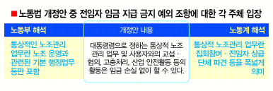 정부와 한나라당 사이에 이견을 보이는 대목은 내년 7월 노조 전임자 임금 지급 금지의 예외적용 범위를 어디까지로 볼 것인가다. 한나라당은 법안에서 “단체협약으로 정하거나 사용자가 동의하는 경우(중략)임금 손실 없이 통상적인 노조관리 업무를 할 수 있다.”고 규정했다.