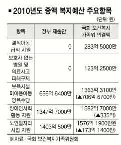 대표적 ‘민생예산’이라고 할 수 있는 복지예산이 상임위원회 심사 과정에서 당초 정부 제출안보다 1조원 이상 증액됐다. 4대강 사업 예산 등을 둘러싸고 파행을 겪고 있는 국회 예산결산특별위원회 심사 과정에서 증액된 민생예산이 얼마나 반영될지 주목된다.