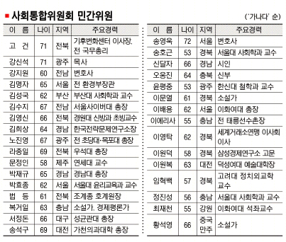 인선(人選)에 애를 먹던 위원장이 임명되면서 사회통합위는 이 대통령이 지난 8·15 광복절 경축사에서 처음 구성계획을 밝힌 이후 4개월 만인 23일 공식출범하게 됐다. 관계부처 장관 등 당연직 의원 16명과 민간위원 32명 등 모두 48명의 위원이 참여한다.