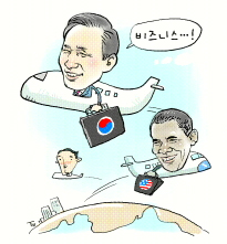 지난주 말 이명박 대통령의 아랍에미리트연합(UAE) 순방은 눈 깜짝할 사이에 시작됐다가 끝났다. 이 대통령은 47조원 규모의 원전 건설 수주 직후 지체 없이 서울로 돌아왔다. 귀국행 비행기 안에서 하룻밤을 보냈기 때문에 1박3일짜리 초단기 순방인 셈이다. 대규모 수행단을 이끌고 여러 곳을 장기간 도는 전형적인 대통령 순방의 모습이라기보다는 기업인의 출장을 연상시킨다. 이는 비단 우리나라만의 모습은 아니다.