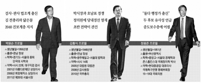 정 의원과 박 시장은 이질적인 부분이 많다. 부산·경남(PK) 출신인 점만 같을 뿐 각기 기업가 출신·보수 여당 정서, 재야 시민단체·젊은 진보계층에 어필하고 있다. 윤 센터장은 “지지계층 측면에서 정 의원은 40~50대의 중도보수층, 글로벌한 도시 비전의 변화를 바라는 유권자들을 공략해야 한다”면서 “박 시장은 2040세대의 젊은 야권 성향 계층이 기반인 반면 정 의원과 김 전 총리는 표심이 겹치기 때문에 경선 단계에서 일반 유권자 공략도 관건”이라고 말했다.