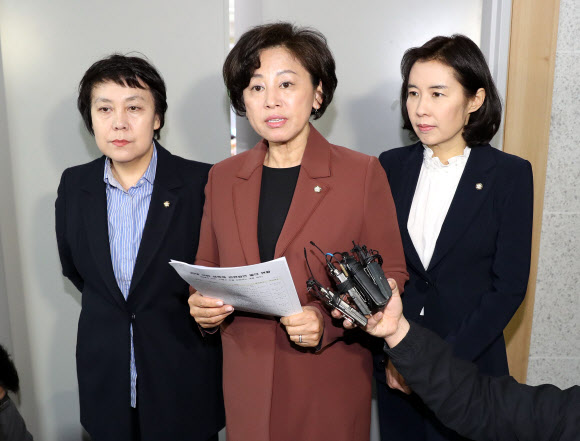 더불어민주당 남인순 젠더폭력대책TF 위원장이 6일 오전 국회 의원회관에서 젠더폭력대TF 긴급대책회의를 열고 안희정 지사의 성폭력 사태와 관련해 입장을 밝히고 있다. 젠더폭력대책TF 측은 안 지사에 대해서는 형법과 성폭력범죄특별법 등 관련법에 의한 엄중 처벌을 촉구하고 또 다른 피해에 대해서도 철저한 진상조사를 요구했다. 왼쪽부터 더불어민주당 정춘숙 의원, 남인순 위원장, 박경미 의원.