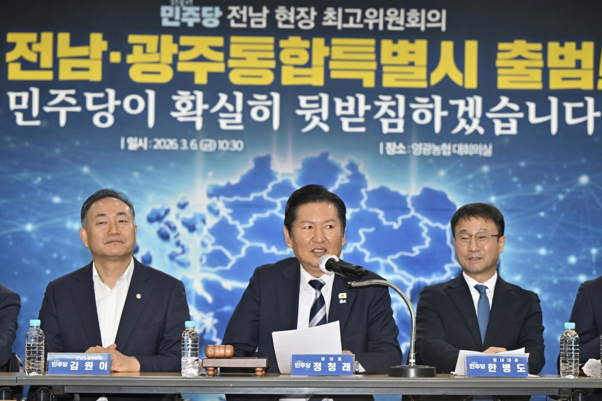 정 대표는 6일 전남 영광군 영광농협에서 현장 최고위원회의를 열고 “이번 특별법 통과로 만들어질 전남·광주 통합특별시는 서울특별시에 준하는 지위를 갖게 돼 대한민국 지방 주도 성장을 선도하는 첫 사례가 될 것”이라며 “4년간 20조원 수준의 지원으로 재정은 보다 튼튼해지고 공공기관 이전과 산업 활성화로 전남·광주의 위상을 드높일 것”이라고 했다.