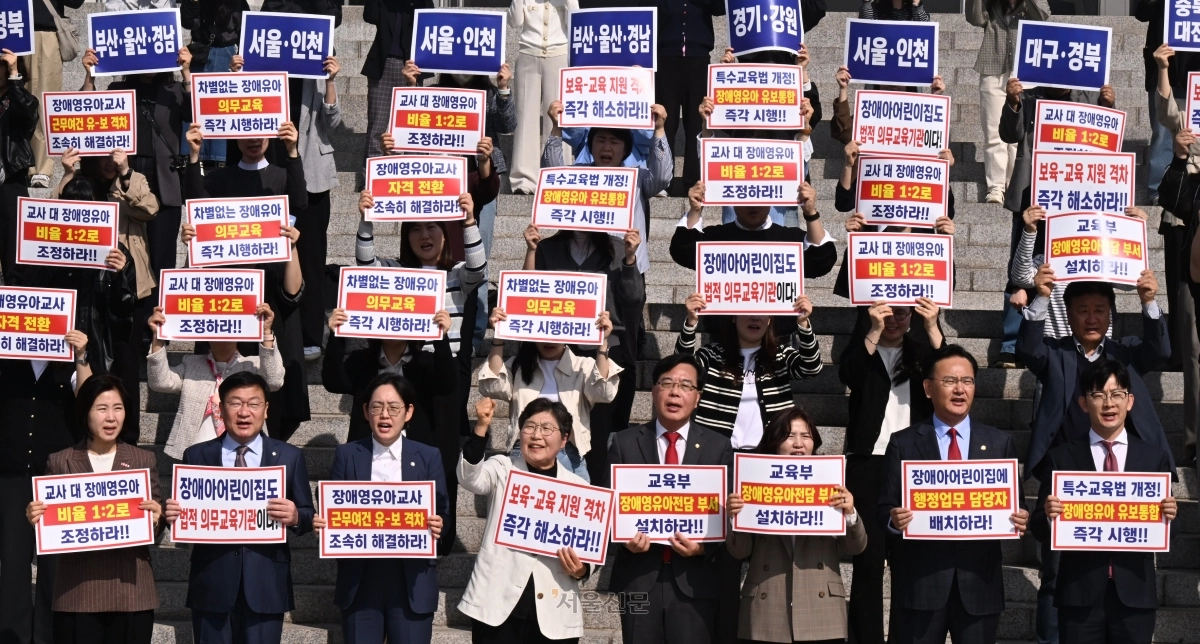 송언석 국민의힘 원내대표가 15일 국회 본청 앞 계단에서 열린 특수교육법 개정을 통한 선제적 장애 영유아 유보통합 시행 촉구대회에서 참석자들과 구호를 외치고 있다. 2026.4.15 안주영 전문기자