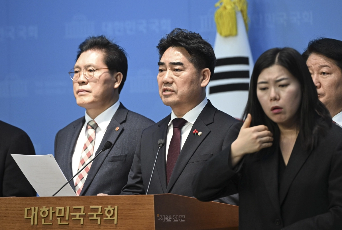 이성권 의원 등 국민의힘 당내 소장파 모임 ‘대안과 미래’ 소속 의원들이 1월 14일 서울 여의도 국회에서 한동훈 전 대표 제명 관련 입장 표명 및 의원총회 개최 촉구 기자회견을 열고 있다. 이지훈 기자