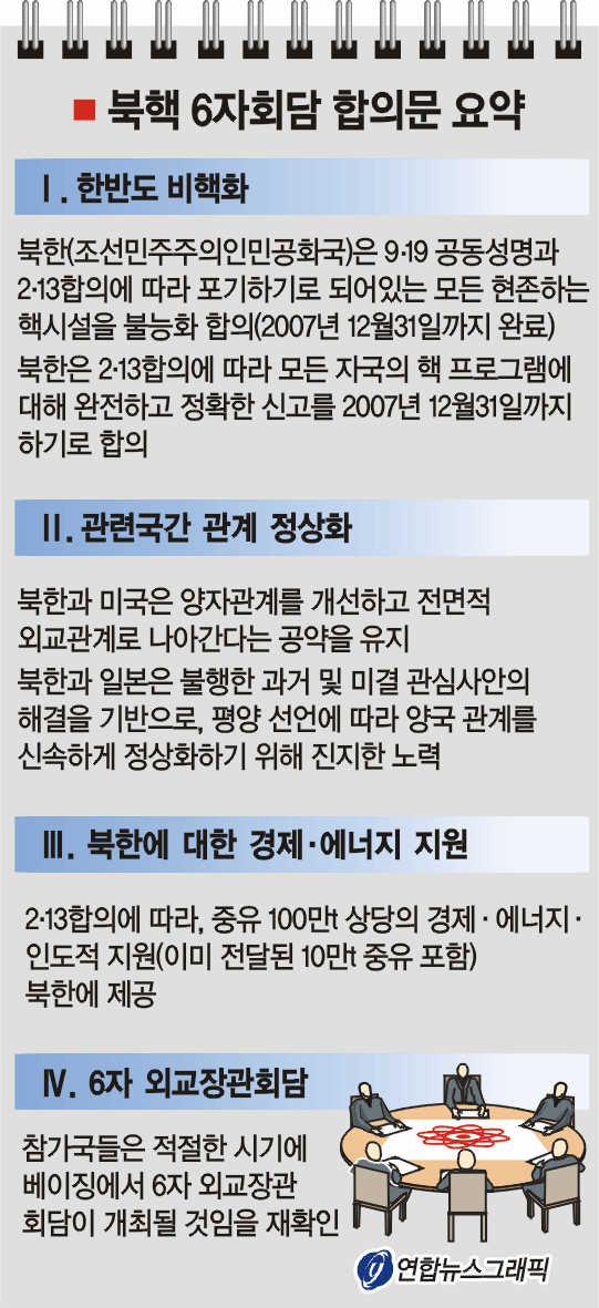 핵 불능화에 대해서 북한이 이 같은 전향적인 조치를 취함에 따라 다른 6자회담 참가국 5개국들은 북한에 대해 상응하는 보상조치로 ‘2·13합의’에 따라 중유 100만t 상당의 경제·에너지·인도적 지원을 제공하는 데도 참가국들은 합의했다.