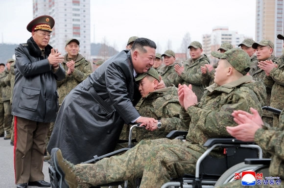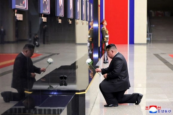 그는 4·25문화회관 중앙홀 ‘추모의 벽’에 있는 전사자 초상에 훈장을 달아주고 헌화·묵상했다. 또 유가족들을 만나 위로했다고 중앙통신은 전했다.
