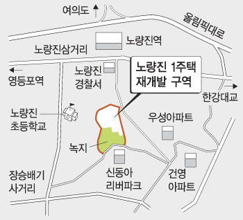 서울시 노량진 1구역은 동작구 노량진동 122의 37일대 5300여평이다. 행정절차가 순조롭게 마무리되면 이 구역은 내년 3월쯤 구청장으로부터 관리처분계획을 인가받은 뒤 공사에 들어간다.