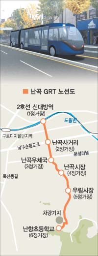 서울시와 관악구(구청장 김희철)는 12일 “지하철 2호선 신대방역∼난향초등학교 3.11㎞ 구간에 2008년 하반기까지 GRT를 도입하는 난곡 신교통수단 건설 기본계획을 확정했다.”고 밝혔다.