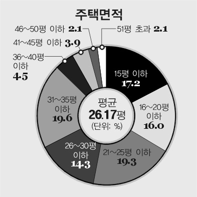 반면 현재 살고 있는 주택면적은 ▲31∼35평 19.6% ▲21∼25평 19.3% ▲16∼20평 16.0% ▲15평 이하 17.2% 등으로 조사됐다. 현재 주거 주택면적 평균은 26.2평, 적정 주택면적 평균은 33.0평으로 집계됐다. 주택 부문의 현실과 이상의 ‘괴리’는 7평 정도인 셈이다.