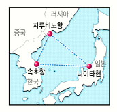 2일 속초시에 따르면 일본 니가타현 경제동우회 20명이 내년 초 러시아 자루비노∼속초∼일본 니가타현을 잇는 항로개설을 위해 속초를 방문, 속초지역 관광 및 무역여건 분석과 속초국제항여객터미널 시설 등을 답사하기로 했다. 번 속초 방문을 통해 새로운 환동해권의 3각 해운루트가 개설될 경우 재일동포들의 백두산 관광은 물론 러시아와 일본의 무역교류에도 청신호가 될 것으로 기대된다. 새롭게 개설될 자루비노∼속초∼니가타현 항로는 기존의 속초∼자루비노를 운항하는 동춘항운㈜ 소속 뉴동춘호가 투입될 전망이다. 자본금 300만달러 규모의 법인이 일본 니가타현에 별도로 설립될 예정이다.
