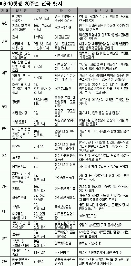 6·10 민주항쟁 20주년을 맞아 전국 각지에서 기념식과 토론회, 전시회, 공연 등 다채로운 기념행사(표 참조)가 열린다. 이번 6·10 민주항쟁 행사는 지난 4월 국무회의에서 국가기념일로 지정된 이후 처음으로 열린다.