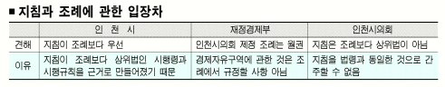 재경부와 행정자치부도 경제자유구역 개발은 경제자유구역법에 따라 위원회의 심의·의결을 거쳐 실시하는 것이기에 조례 적용 대상이 아니라고 강조한다. 특히 경제자유구역법은 효과적인 개발을 위해 다른 법에 의한 절차마저 간소화하는 특별법적 성격을 갖고 있는데 지자체 조례로써 무력화시키려 해서는 안 된다는 것이다. 이에 대한 시의회의 반론도 만만치 않다. 중앙 부처의 지침이 지방법인 조례에 우선한다는 것을 인정하지 않는다. 법령에 해당되는 시행령과 시행규칙이 조례보다 상위법 개념인 것은 인정하지만 시행령 등을 근거로 만든 지침을 법령과 동일한 것으로 간주하기는 힘들다는 것이다.