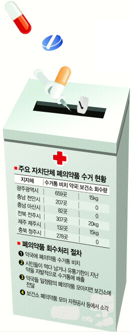 폐의약품 회수 절차는 간단하다. 가정에서 남은 의약품을 가까운 약국에 비치된 수거통에 버리면 된다. 수거된 약들은 자치단체 산하 보건소에 모아졌다가 절차에 따라 한꺼번에 소각된다. 그러나 충북 청주시는 지난 6월23일 약사회 등과 협약을 체결하고 278개 약국에 수거통을 비치했지만, 그동안 시민들이 가져온 약이 한 줌도 되지 않는다는 것이다. 모아진 폐의약품을 보건소에 전달한 약국이 이날 현재 단 한 곳도 없다. 광주광역시 15㎏, 전북 전주시 20㎏, 제주 제주시 15㎏에 그쳤고 목포 등 5개 시·군이 참여하고 있는 전남에선 127㎏이 모아졌다. 반면 서울 도봉구는 지역의 134개 약국을 통해 올해만 800㎏ 이상의 폐의약품을 수거했다. 3년간 누적회수량은 이미 2t을 넘었다.