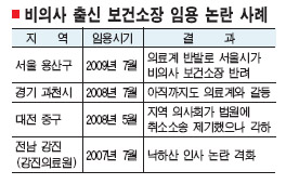 과천시도 지난 7월 새 보건소장(직무대리)에 의사가 아닌 시 보건직 공무원을 임명해 의료계와 갈등을 빚고 있다. 2007년 대전 중구에서는 비의사 보건소장이 임명되자 지역의사회가 취소 소송까지 내는 등 홍역을 치르기도 했다.