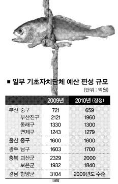 실례로 부산 동래구는 내년 예산을 올해 1330억원보다 줄어든 1300억원(잠정)으로 긴축 편성할 계획이다. 그러나 동래구는 내년에 세입감소로 50억원, 재산세 15억원, 조기집행 잉여금 38억원 등 모두 103억원의 결손이 예상돼 실제 내년 편성 예산 규모는 더 줄어들 것으로 보인다. 반면 정부의 서민안전시책에 따라 기초노령연금 확대 등 사회복지예산은 증가, 올해보다 20% 이상 늘어날 것으로 보인다.