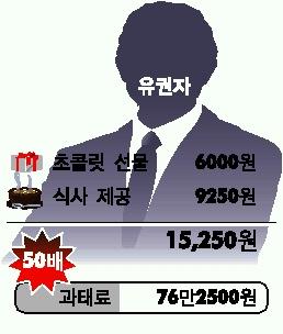 1만 2000원 또는 1만 5000원어치의 식사를 제공받은 유권자 69명이 그 50배를 과태료로 물게 됐다.부과금액은 각자 60만원이나 75만원에 이른다.1만 5250원어치의 초콜릿과 식사를 제공받은 유권자 3명도 역시 50배인 76만 2500원을 과태료로 부과받게 됐다.