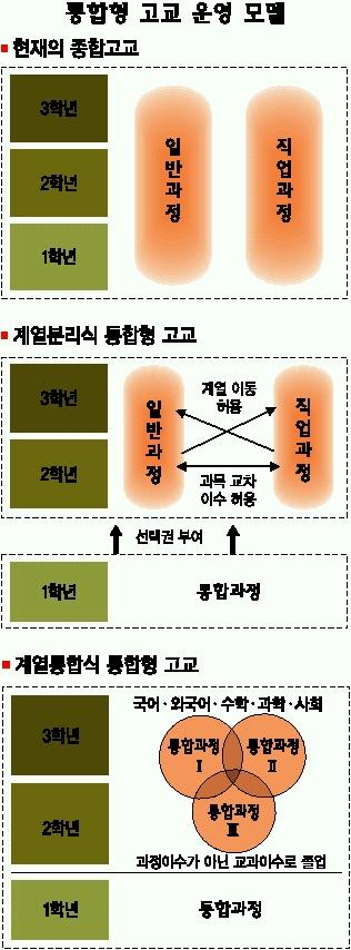 통합형 고교는 한 학교에 인문교육 과정과 직업교육 과정을 동시에 개설해 학생의 적성과 진로 희망에 따라 과정을 선택,이수케 하는 학생 중심의 학교체제.인문·실업계 구분없이 진학한 뒤 2·3학년때 진학 및 진로를 결정하면 된다.이 때문에 인문계와 자연계 교육과정을 한 학교 안에 두고서도 진학 때 결정한 인문계·실업계 여부에 따라 졸업까지 그대로 가야 하는 종합고와 확실하게 구분된다.