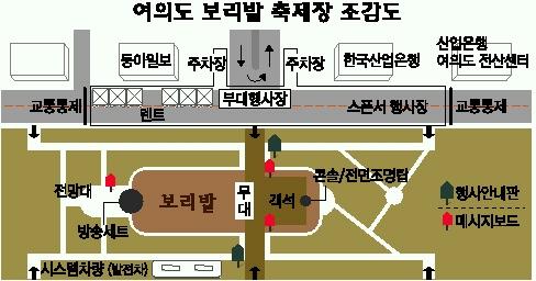 보리밭 앞에 설치될 ‘희망나무’도 눈길을 끌 것으로 보인다.3.5m 높이의 철제 골조로 만든 희망나무는 나무 앞에 설치된 코너에서 오색지에 소망의 글을 적어 걸면 나뭇잎처럼 물결이 치는 건강한 나무로 변한다.문화마당 주변은 벚꽃이 만발해 나들이 승용차들이 붐빌 것으로 예상된다.지하철 5호선 여의도역에서 가깝다.
