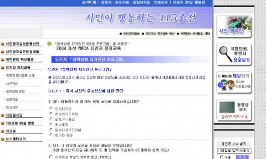 경실련의 ‘유권자 정당선택 도우미’(www.ccej.or.kr/election) 프로그램은 지난달 25일 선 보인 이래 3만 6000명이 넘는 유권자가 이용할 만큼 호응을 얻고 있다.지난달 말부터 온라인 서비스를 시작한 YMCA의 ‘정책성향 자가진단 테스트’(www.vote415.ymca.or.kr)도 하루에 200명이 넘는 유권자가 꾸준히 이용한다.