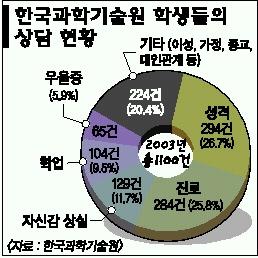 전현숙 전임상담원은 “학생들은 상담 때마다 ‘노벨상을 탈 수 있는 세계적 과학자가 되고 싶은’이라는 수식어를 붙여 말할 정도로 자부심이 강한데 경쟁에 밀리면서 자신감 상실로 이어지고 있다.”고 말했다.극단적으로는 자살로 이어져 매년 2∼3건의 자살사건이 터지고 있다. 카이스트신문사 편집장 임수용(21·산업공학과 3년)군은 “카이스트 학생들은 진로나 성적문제 못지않게 군대문제도 심각하게 고민하고 있다.”고 밝혔다.