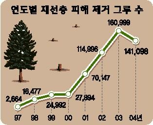 지난 98년 재선충이 첫 발생한 진주시는 피해면적이 640㏊에 달한다.지난 6년간 13만 1720여그루가 벌목됐고 올해에도 4만여그루를 제거할 계획이다.진주시는 그나마 적극적인 방제로 7년째인 올해 처음 재선충 발생이 지난해(5만 1150그루)보다 줄었다.3개 방제단(192명)이 벌목작업을 하고 예찰조사원(12명)을 가동하는 등 체계적인 방제활동을 편 결과로 보고 있다.