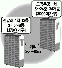 2002년 6월 도곡동 527 일대의 5층짜리 도곡주공 1차 아파트는 16∼24층 34개동(3002가구) 규모의 ‘도곡렉슬’을 짓는 재건축 계획을 시작했다.2006년 2월 준공예정이었다.30∼40m 떨어진 진달래 1차 아파트 3동과 5∼9동 400여가구 주민들은 즉각 반발했다.5층짜리 아파트가 16∼24층으로 올라가면 일조·조망권이 침해된다는 것이었다.진달래아파트는 12층짜리 건물.