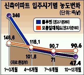 입주 1∼3개월인 17개 아파트 가운데 6가구(35%)의 포름알데히드 측정치가 권고기준을 밑돈 반면 입주 10∼12개월인 22개 아파트에서는 8가구(37%)가 권고치를 초과한 것으로 나타났다.국립환경연구원 장승기 연구관은 “시공사별로 사용한 건축자재와 입주자의 관리상태 등이 서로 달라 이같은 차이가 난 것으로 보인다.”고 말했다.