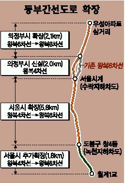시는 올해 말 실시 설계용역을 맡기고 2006년 착공해 2009년 도로확장을 마칠 계획이다.동부간선도로 확장사업은 재원조달이 항상 걸림돌이었으나 지난 4월 도봉구 창4동 녹천지하차도∼시계구간을 포함해 의정부시 국도3호선까지 광역도로로 지정됨에 따라 총 사업비의 50%를 국고를 통해 지원받을 수 있게 됐다.