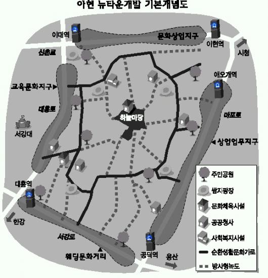 최근 선진국에서 일고 있는 뉴 어버니즘(New Urbanism)을 토대로 걸어다닐 수 있는 거리 안에 직장과 주거,상업,놀이시설 등이 몰려 있는 복합생활문화타운이 개발의 기본방향이다.높이 87.5m의 중앙 구릉지에는 공원,체육시설 등을 갖춘 1만 4000평 규모의 ‘하늘마당’이 들어선다.아현뉴타운은 교통시설,지형,기반시설 등을 고려해 이대·아현·대흥·공덕 등 4개 소생활권으로 나뉘며 각 생활권별로 공공시설,문화복지시설 등이 도보권인 400m 이내에 배치된다.4개 소생활권은 자전거도로와 보행녹도를 포함한 원형의 순환생활도로로 연결된다.이 도로를 따라서는 소규모의 쌈지공원,문화시설,공공시설 등이 들어선다.