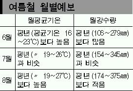 기상청은 20일 ‘여름철 계절예보’에서 “올 여름은 다음달 중순부터 장마가 시작,예년보다 조금 빠른 7월 중순부터 점차 그치겠다.”고 전망했다.또 “특히 7월 하순부터 8월 초순 사이에는 무더운 날씨가 많아 10년 만에 최고로 더운 여름이 올 것”이라고 예보했다.기온의 경우,다음달 초순에는 평년보다 다소 높다가 중순 장마가 시작되면서 평년과 비슷해지거나 낮은 분포를 잠시 보이겠다.그러나 7월 하순부터 8월 초순 사이에는 북태평양 고기압이 중국 내륙지역까지 크게 확장하면서 평년보다 높겠다.강수량은 평년의 451∼894㎜와 비슷하겠다.주로 여름철 전반부에 비 오는 날이 많고 후반부에는 예년에 비해 강수량이 적겠다.