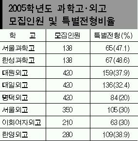서울의 6개 외국어고교의 2005학년도 특별전형 모집인원이 지난해보다 9.9%(208명)나 줄어든다.과학고의 특별전형 인원은 132명으로 지난해와 같다.