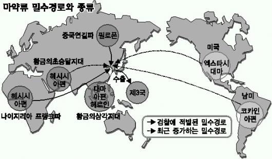 중국동포와 결혼을 알선하는 것처럼 속여 마약을 밀반입하는 등 밀수방법이 교묘해지고 있다.특히 중국,동남아 등 종전의 밀수경로도 아프리카·중동 등으로 다양화되고 있다.