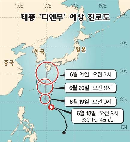 하지만 태풍은 한반도에 직접적인 영향을 주지 않고 동해상으로 빠져나갈 전망이다.지난 13일 미국 괌 서남서쪽 1050㎞ 해상에서 발생한 ‘디앤무’는 중국신화에 나오는 ‘천둥과 번개를 관장하는 여신’을 뜻한다.태풍이 지나간 뒤인 24∼25일부터는 전국이 장마권에 들 것으로 보인다.