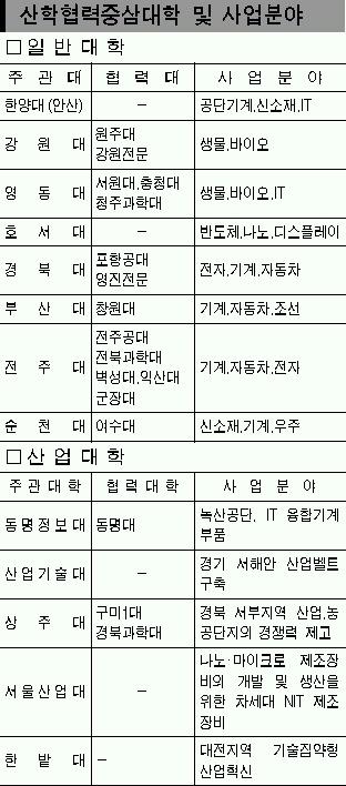 교육인적자원부·산업자원부·국가균형발전위원회는 19일 지역별 산·학협력 체제의 구축 및 확산을 이끌 중심대학으로 일반대 8개대와 산업대 5개대를 선정,올해부터 5년간 2000억원을 투입하기로 했다고 발표했다.