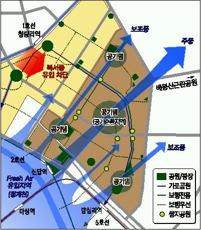 뉴타운에는 큰 바람 길 5개가 생긴다.한가운데를 가로지르는 주풍(主風)을 중심으로 양쪽에 2개씩 보조풍을 다스리는 바람 길이 뚫린다.이에 따라 높은 나무를 빽빽하게 심어 신선하고 차가운 공기가 한데 갇혔다가 강력하게 확산되도록 하는 공기댐이 군데군데 들어선다.주풍은 기존 전농·답십리초등,동대문중과 새로 유치하는 1개 고교를 묶어 이뤄지는 ‘스쿨파크’(School park)를 지난다.학교시설복합화 사업으로 공원과 녹지시설 등이 들어서는 스쿨파크는 공기 순환기능을 하는 바람 길의 주댐 역할을 한다.부지면적으로 따질 때 보통 독립된 한 학교가 4000여평인데,학교군(群)을 2만 5000여평에 이르는 대규모로 조성하는 이유도 바로 바람 길을 위한 녹지 때문이다.