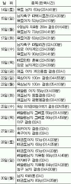 올림픽이 열리는 그리스가 우리나라와 6시간의 시차가 있는 만큼 경기를 시청하려면 어쩔 수 없이 2주일동안 새벽잠을 포기해야 하기 때문이다.더구나 축구와 농구 등 인기 종목과 태권도·양궁·유도·레슬링 등 ‘메달박스’종목의 결승전이 대부분 한국시간으로 새벽 1∼4시에 집중되어 있다.