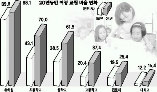 그러나 여성은 관리직인 교장·교감은 2004년 4월 현재 교장이 전체의 7.8%,교감은 13.2%에 불과했다.여교사 비율이 높은 초등학교와 중학교도 여성 교장은 각각 6.7%,10.9%에 그쳤다.