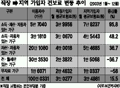 22일 국회 보건복지위가 내놓은 ‘2003년말 결산보고서’에 따르면 지난해 실직 등으로 직장에서 지역으로 옮긴 건강보험 가입자는 모두 100만 331가구다.이들은 직장가입자일 때는 월평균 3만 277원의 보험료를 냈지만,지역으로 옮긴 뒤에는 4700원가량(15.5%)오른 3만 4981원을 냈다.직장보험료는 사업주가 내주는 절반을 제외하고 나머지 본인부담금만으로 비교한 것이다.