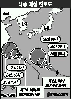 한편 24일 타이베이 동쪽 해상에서 북서진하고 있는 제17호 태풍 ‘에어리’는 타이완을 관통하여 한반도에는 별 영향을 미치지 않을 전망이다.