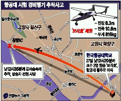 이들은 이날 낮 12시20분쯤 한국항공우주연구원에서 개발한 소형비행기 보라호의 성능시험을 위해 항공대 활주로를 이륙했으나 15분 뒤 관제소와의 무선교신이 끊어졌다.