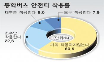 정식 직원이 아닌 아르바이트 운전사가 40.3%였고,평균 시속 60㎞ 이상으로 운행한다는 운전사가 19.7%였다.안전띠가 어린이에게 적합하지 않고 조정 가능한 설치도 해놓지 않은 버스도 41.7%나 됐다.당연히 대형사고로 이어진다.지난 6월30일 충북 청원군 내수읍에서는 어린이집 통학버스가 승용차와 충돌한 뒤 전봇대를 들이받아 안전띠를 매지 않은 김모(5)양 등 14명이 숨지거나 다쳤다.